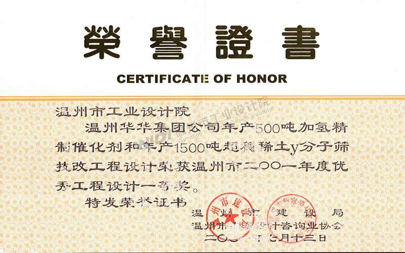 溫州華華集團(tuán)公司年產(chǎn)500噸加氫精制催化劑和年產(chǎn)1500噸超穩(wěn)稀土Y分子篩技改工程設(shè)計 溫州市2001年度優(yōu)秀工程設(shè)計一等獎