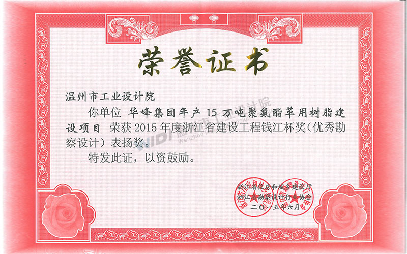 華峰集團(tuán)年產(chǎn)15萬噸聚氨酯革用樹脂建設(shè)項(xiàng)目建設(shè)工程 錢江杯表揚(yáng)獎